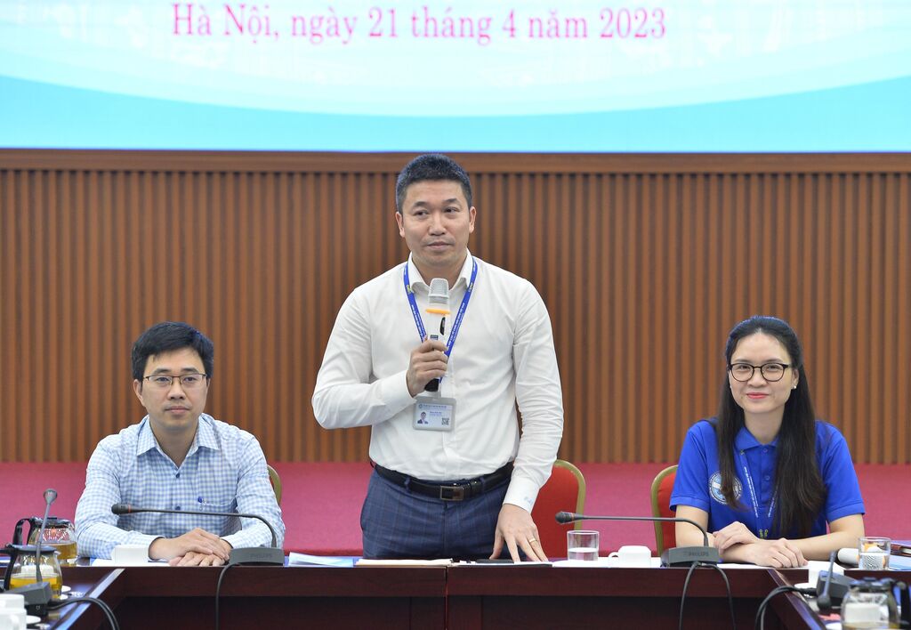 | Le secrétaire de l'Union des jeunes de l'Agence Vietnamienne d'Information (VNA), Lê Minh Duc, partage son point de vue lors du colloque. |