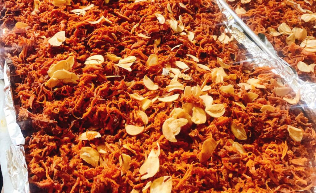 | Confiture de noix de coco aux couleurs colorées préparée par Nguyên Thi Thom pour le Têt. |