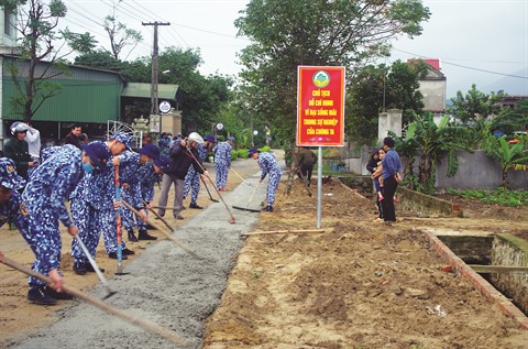 | Les jeunes soldats de la Police maritime à Hà Tinh (Centre) bétonnent un chemin rural. |