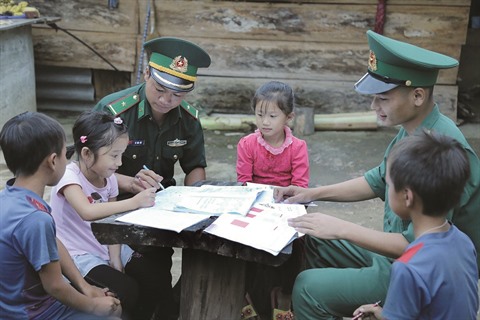 | Des jeunes militaires de la garde-frontière de Muong Cai, province de Son La (Nord), enseignent aux enfants locaux. |