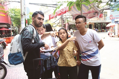 | Des jeunes guides bénévoles en train d’aider un touriste étranger à Hô Chi Minh-Ville. |