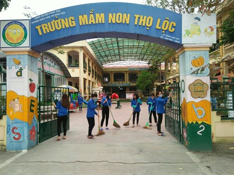 | Jeunes participant au nettoyage de l'école maternelle Tho Lôc à Hanoï. Photo : Mai Anh/CVN |
