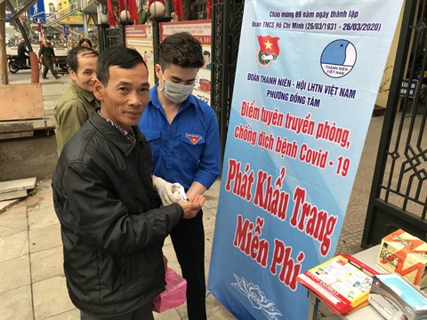 | Des jeunes volontaires distribuent des masques de protection à des habitants de Hanoï. |