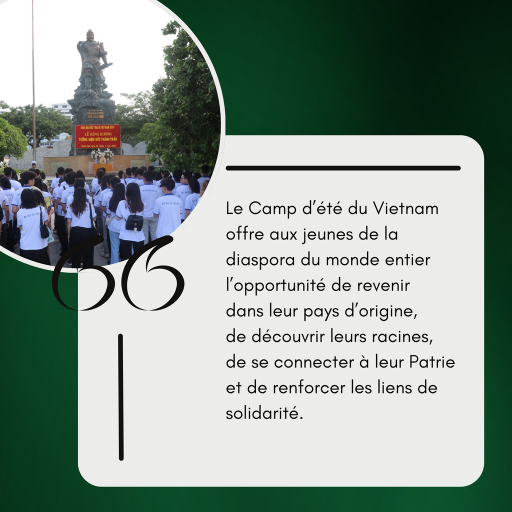 Organisé annuellement par le Comité d’État chargé des affaires des Vietnamiens d’outre-mer, relevant du ministère des Affaires étrangères, en collaboration avec d’autres ministères et organismes, le Camp d’été du Vietnam offre aux jeunes de la diaspora du monde entier l’opportunité de revenir dans leur pays d’origine, de découvrir leurs racines, de se connecter à leur Patrie et de renforcer les liens de solidarité.
