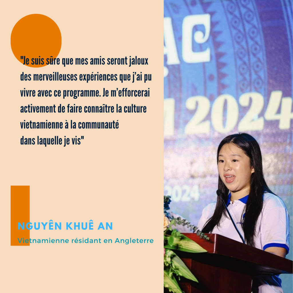 Pour Khuê An, le Camp d’été du Vietnam 2024 est aussi l’occasion de visiter le pays natal de ses ancêtres, de renforcer ses compétences en vietnamien, et d’approfondir sa compréhension de l’histoire et de la culture vietnamiennes. De plus, elle a l’opportunité de s’y faire de nouveaux amis, de découvrir la diversité des paysages et de savourer la riche gastronomie de chaque ville.