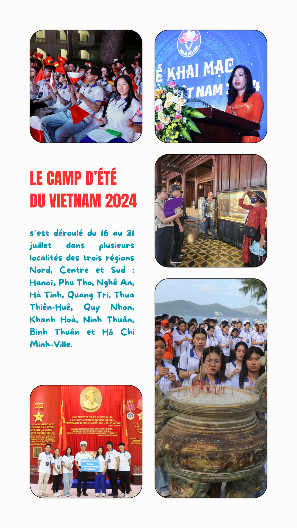 Le Camp d’été du Vietnam 2024 s’est déroulé du 16 au 31 juillet dans plusieurs localités des trois régions Nord, Centre et Sud : Hanoï, Phu Tho, Nghê An, Hà Tinh, Quang Tri, Thua Thiên Huê, Quy Nhon, Khanh Hoà, Ninh Thuân, Binh Thuân et Hô Chi Minh-Ville.