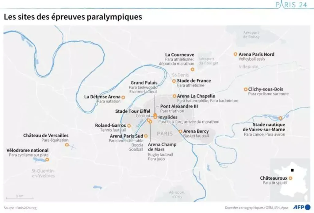 S'en suivront 11 jours de compétition, jusqu’au 8 septembre, dans la plupart des mêmes sites qui ont rythmé les Jeux olympiques, comme le Grand Palais (escrime fauteuil et para-taekwondo) ou les Invalides (para tir à l’arc), avec une mascotte quasi identique, une "Phryge" portant une lame de course en carbone, et une flamme qui brillera dans la vasque du jardin des Tuileries après quatre jours de parcours dans toute la France.