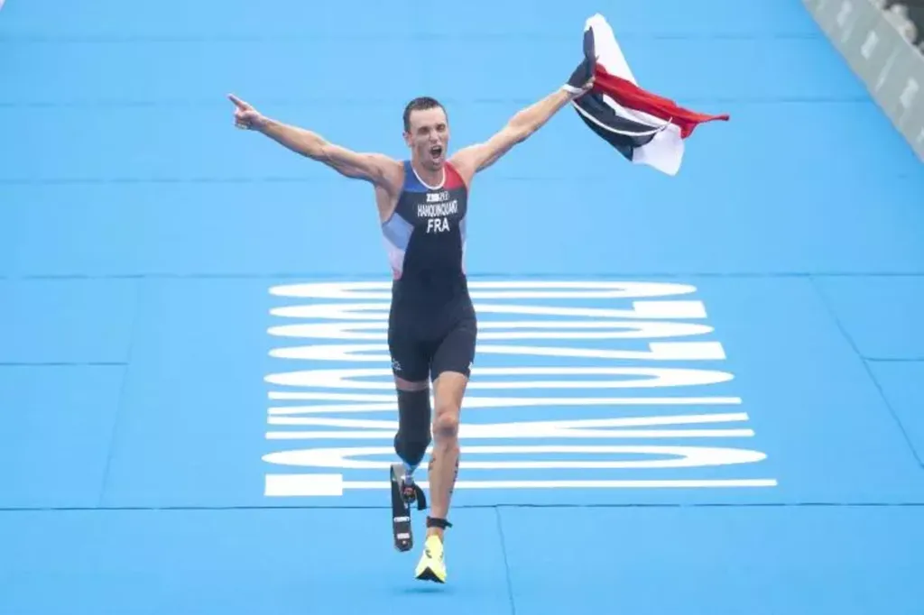 | Le para-triathlète français Alexis Hanquinquant, qui sera porte-drapeau de la cérémonie d'ouverture, lors de sa victoire aux Jeux paralympiques de Tokyo, le 28 août 2021. |
