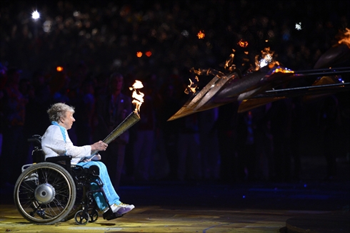 | La vasque, formée de plus de 200 flammes, a été allumée à minuit pile par Margaret Maugham, qui remporta une médaille d'or aux premiers Jeux paralympiques à Rome en 1960. Photo : AFP/VNA/CVN |