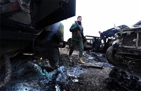 | Un combattant peshmerga marche parmi des voitures calcinées après un attentat suicide perpétré par le groupe État islamique à Kesarej, au Nord de l'Irak, près de la frontière avec la Syrie le 18 décembre. |