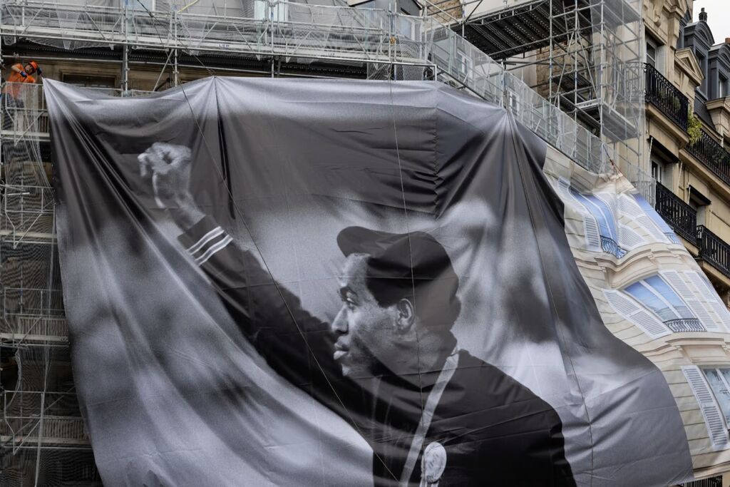 | L’installation de la bâche avec la photo prise par Raymond Depardon de l’athlète américain Lee Evans, symbole de la lutte contre les discriminations raciales lors des JO de Mexico en 1968. |