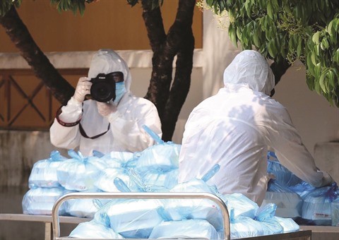 | Le reporter Viêt Duc, de la chaîne télévisée de la VNA - Vnews, travaille dans une zone de quarantaine à Dà Nang (Centre), en 2020. |