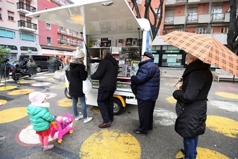 Chaque matin, il débarque avec son triporteur au vrombissement reconnaissable entre tous, se gare sur une placette d'un quartier de Milan et ouvre les deux portes de son Ape : réponse à la crise de la presse, le kiosque à journaux itinérant est né.