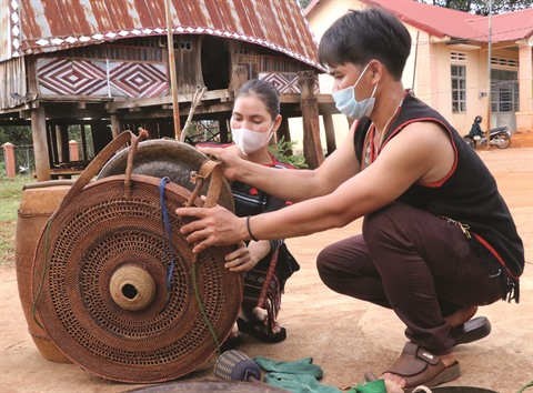 C’est la raison pour laquelle les gongs sont choyés et si bien protégés. Ils sont mis dans des housses de protection en bambou appelées affectueusement "vêtements". Pour chaque Nouvelle Année, leurs propriétaires ont tradition de changer ces "habits" en en tissant de nouveaux. Focus sur cet artisanat des Jrai vivant dans la commune d’Ia O, district d’Ia Grai, province de Gia Lai.