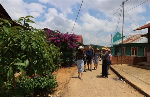 | Touristes étrangers au village de B’Nor C, province de Lâm Dông (hauts plateaux du Centre). |