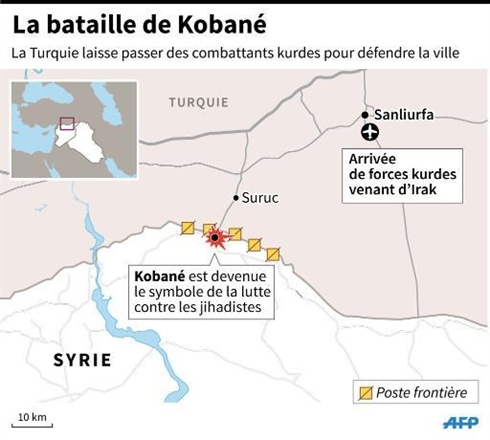 L'arrivée vendredi 31 octobre à Kobané via la frontière turque des 150 peshmergas venus du Kurdistan irakien, aiderait à remonter le moral des forces kurdes syriennes défendant la ville depuis plus de six semaines, même si des militants et une ONG ont jugé nécessaires davantage de renforts et d'armes pour déloger les jihadistes.