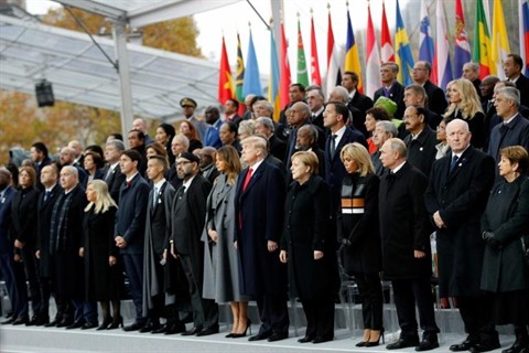 | Les dignitaires étrangers assistent à la cérémonie commémorant le centenaire de l'armistice sous l'Arc de Triomphe à Paris, le 11 novembre. |