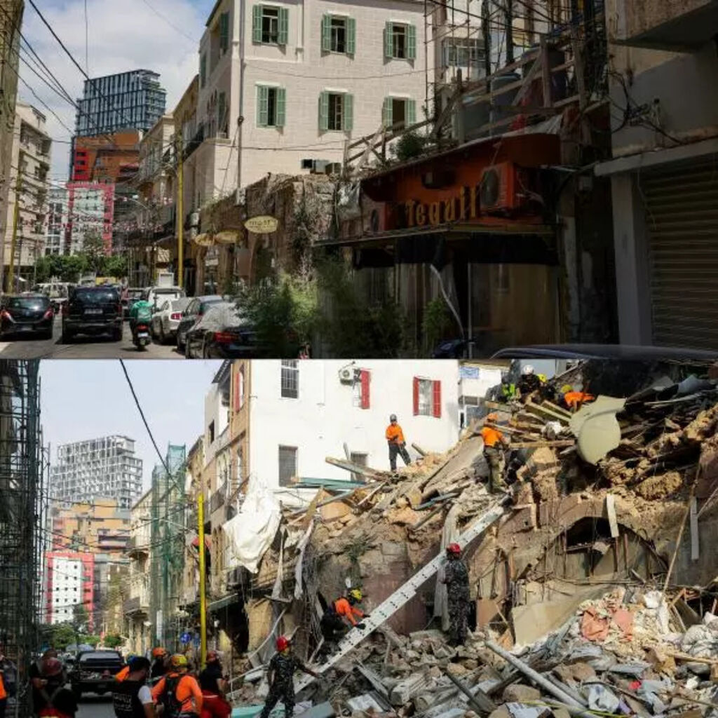 | Photomontage d'un immeuble rénové à Beyrouth le 2 août 2023 et le 3 septembre 2020 un mois après l'explosion ayant frappé le port de la capitale libanaise. |
