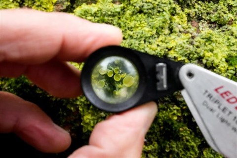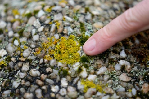 Lichénologue professionnel, Joël Esnault explore le massif armoricain loupe collée à l'œil, pour mieux percer les mystères des innombrables mosaïques colorées formées par les lichens.