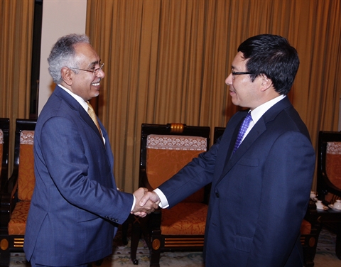 | Le vice-Premier ministre Pham Binh Minh (droite) et l'ambassadeur du Qatar, Abdullah ultan Al-Hamar. |