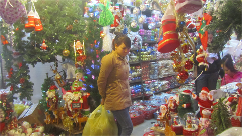 Les rue Hàng Ma et Luong Van Can attirent les badauds. Des boutiques de décorations de Noël y vendent des sapins, des pères Noël ou encore de la neige synthétique.