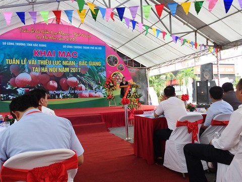 | La cérémonie d’ouverture de la Semaine des litchis Luc Ngan de Bac Giang (Nord), le 16 juin, au supermarché Big C Thang Long à Hanoï. |
