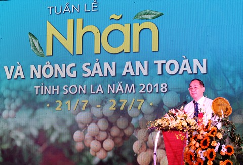 | Trân Quôc Khanh, vice-président du Comité populaire provincial de Son La, prend la parole à la cérémonie d’ouverture de la Semaine des longanes et des produits agricoles de Son La, le 21 juillet à Hanoï. |