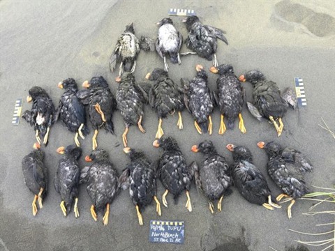 | Photo de macareux morts, prise et transmise par les services de préservation de l'environnement de la communauté aléoutienne de l'île Saint-Paul, en Alaska. |