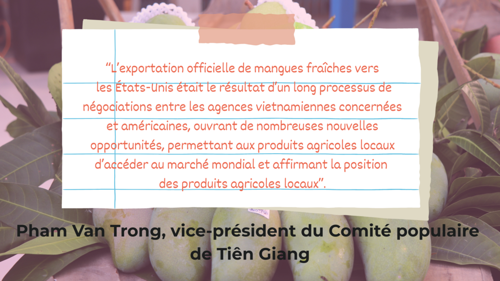 Cela permet d’assurer la traçabilité, la qualité et la conformité des mangues exportées aux normes internationales, renforçant ainsi la compétitivité des fruits vietnamiens sur les marchés mondiaux.