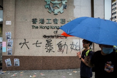 Certains manifestants s'en sont pris aux locaux de la Fédération des syndicats, une organisation pro-Pékin, les couvrant de graffitis et les bombardant d'œufs.