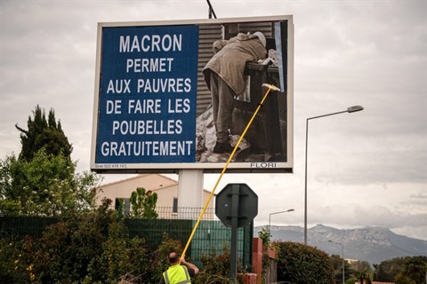 | Un afficheur varois, pro "gilets jaunes" commente l'actualité en 4 par 3, à La-Seyne-sur-Mer, le 25 avril 2019. |