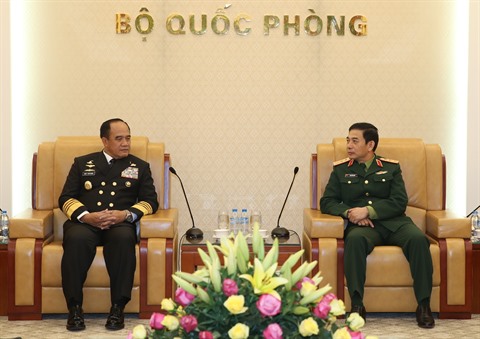 | Le général de corps d’armée Phan Van Giang (droite), chef d'État-major de l'Armée populaire du Vietnam, et l'amiral Ade Supandi, commandant de l’Armée navale de l’Indonésie, le 28 novembre à Hanoï |