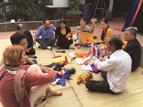 | Les artistes présentent à des touristes l’art des marionnetes de leurs ancêtres. |