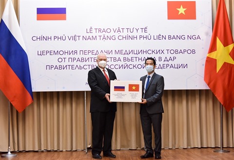 | Le vice-ministre des Affaires étrangères Tô Anh Dung (droite) a remis, le 13 avril à Hanoï, 150 000 masques en tissu antibactériens fabriqués par le Vietnam à l'ambassadeur russe au Vietnam, K. Vnuko. |