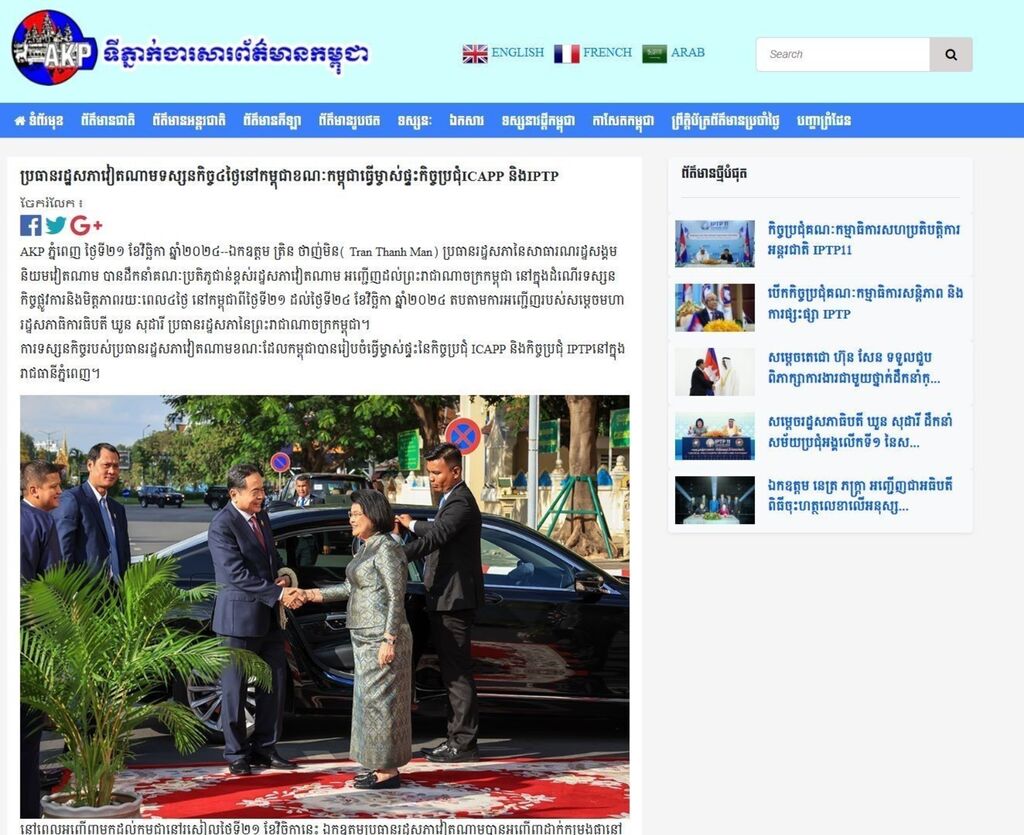 | Le site web de l'Agence de presse cambodgienne (AKP) présente des activités du président de l'AN du Vietnam, Trân Thanh Mân, au Cambodge. |