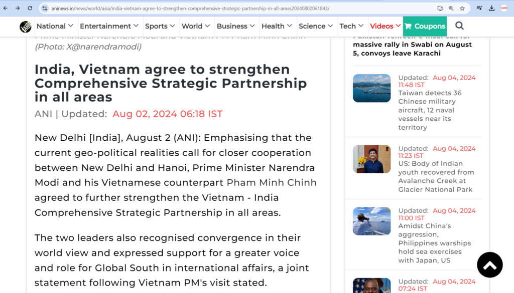 | Un article sur le l'agence de presse Asian News International publié le 2 août (heure locale), après la visite d'État du Premier ministre vietnamien. |