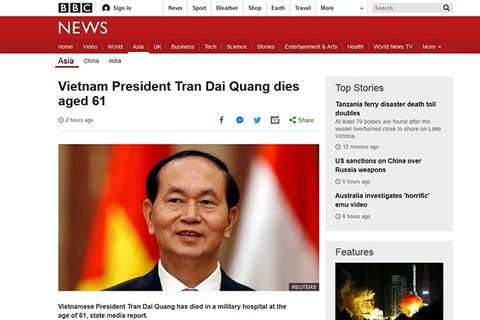 RAI Italia, l’agence chinoise Xinhua, l’AFP et Reuters ont tous annoncé le décès du président Trân Dai Quang. L’AFP a cité des propos du porte-parole du ministère chinois des Affaires étrangères, Geng Shuang, selon lesquels, le président Trân Dai Quang était un dirigeant remarquable qui avait eu des contributions à la réforme, au développement et à l’ouverture du Vietnam.
