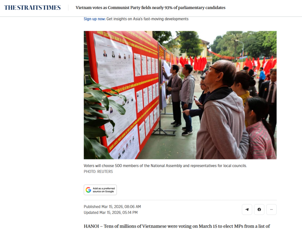 La presse singapourienne a également relayé l’information sur ces élections. Le journal The Straits Times et la plateforme Channel NewsAsia ont indiqué que des dizaines de millions de Vietnamiens se rendaient aux urnes pour élire 500 députés de l’Assemblée nationale parmi 864 candidats, ainsi que les membres des Conseils populaires à différents niveaux, répartis dans 182 circonscriptions électorales à travers le pays.