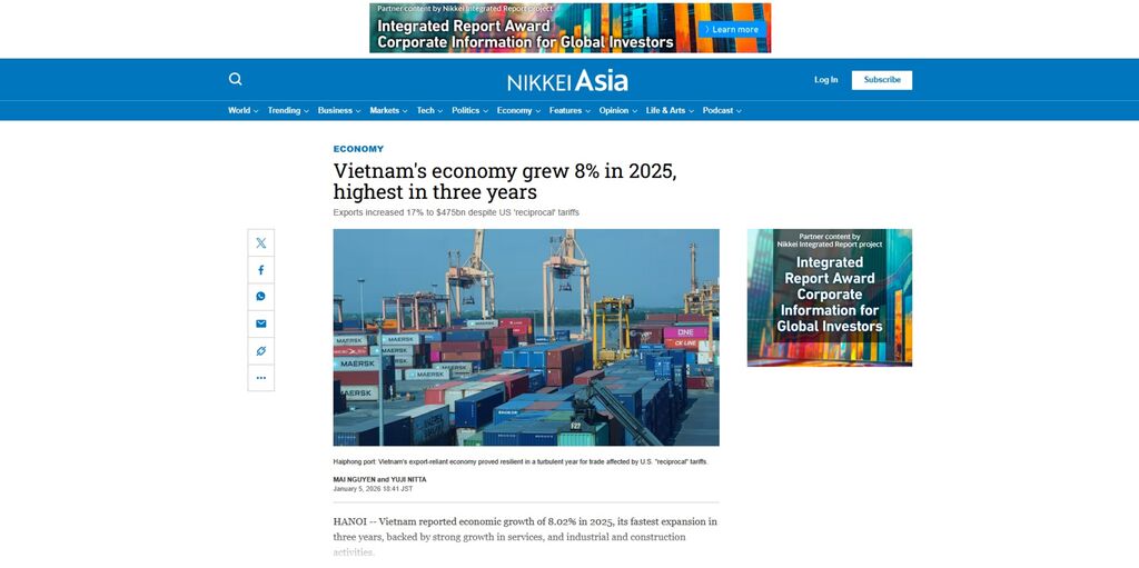 Selon Nikkei Asia, le taux de croissance de 8,02% enregistré en 2025 constitue la progression la plus rapide de l’économie vietnamienne au cours des trois dernières années et place le pays parmi les économies affichant les rythmes de croissance les plus élevés des quinze dernières années.