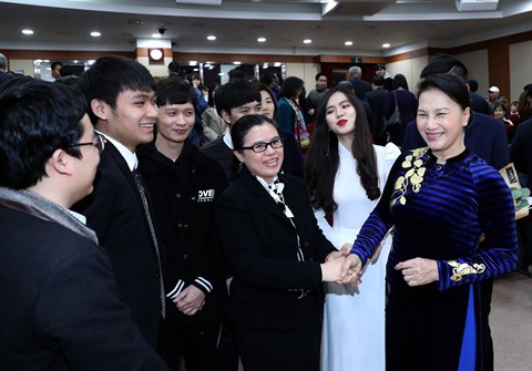 | La présidente de l’Assemblée nationale Nguyên Thi Kim Ngân (droite) et des étudiants vietnamiens suivant des cursus à l'université nationale de Pukyong (République de Corée). |