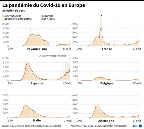 Après une accalmie au début de l'été, le nombre d'admissions à l'hôpital à cause du COVID-19 est reparti à la hausse en France. Les hôpitaux ont admis 234 nouveaux patients au cours des dernières 24 heures lundi-après-midi 17 août, contre 173 vendredi 14 août. 30.429 personnes sont mortes dans le pays depuis le début de la pandémie.