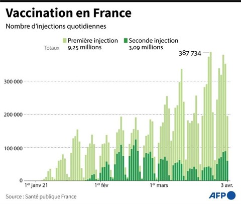 Lundi 5 avril, plus de 9,3 millions de personnes avaient reçu une première dose. Le M. Vaccin du gouvernement, le Pr. Alain Fischer, a annoncé à la fin de la semaine un objectif à court terme de 400.000 injections quotidiennes. Selon M. Véran, le pays "n'a aucun enjeu de logistique, mais de livraison de vaccins".