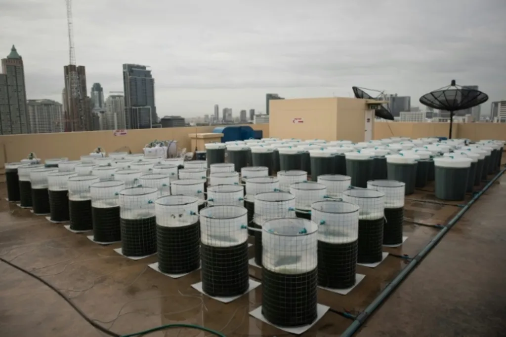 | Une ferme de spiruline sur le toit d'un hôtel à Bangkok en Thaïlande. |
