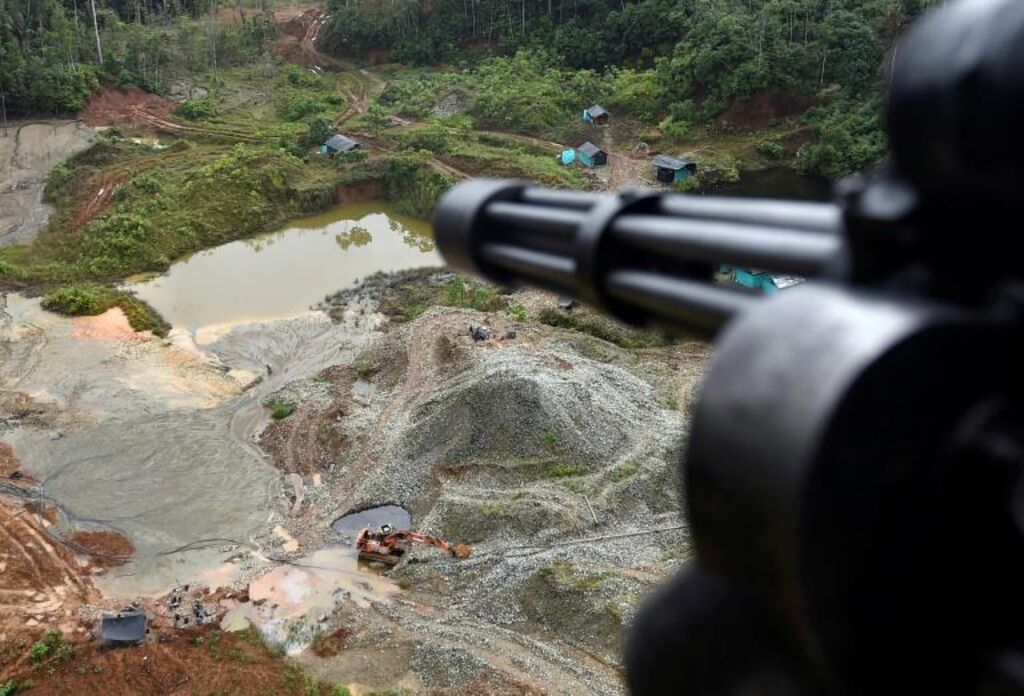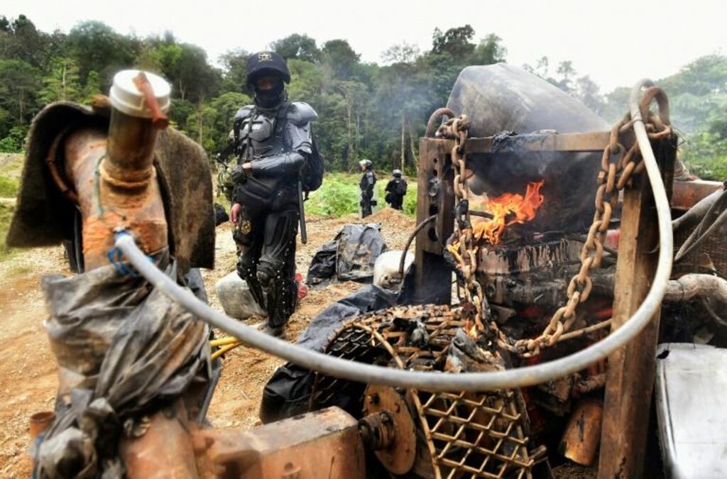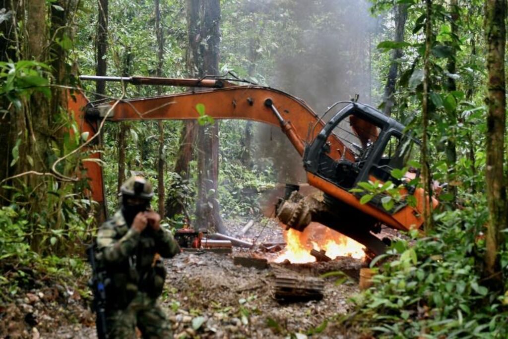 Au milieu de la végétation, dans cette région frontalière avec l'Équateur où l'AFP a pu se rendre, non loin des cratères creusés par les mineurs, huit engins de chantier sont détruits à l'aide d'explosifs ou de grenades.