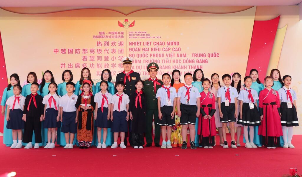 | Les deux ministres posent avec des élèves de l’École primaire Dông Dang, dans la province vietnamienne de Lang Son, et de l’École primaire N°4 de la ville de Pingxiang, dans la région autonome Zhuang du Guangxi, en Chine. |