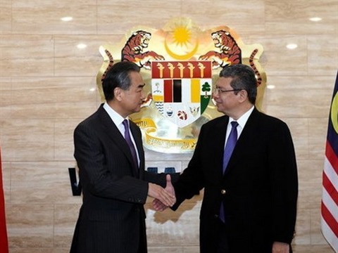 | Le ministre chinois des Affaires étrangères Wang Yi (gauche) serre la main de son homologue malaisien Saifuddin Abdullah. |