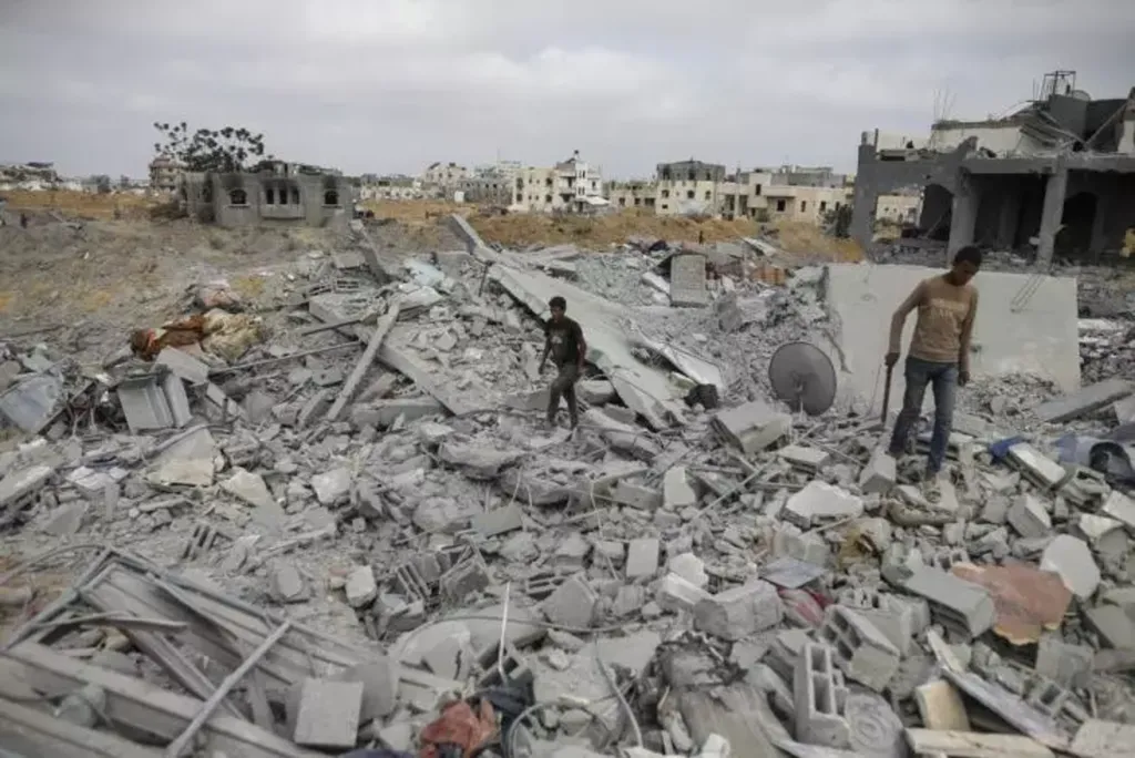 | Des Palestiniens regardent les destructions après une frappe aérienne israélienne à Khan Younès, dans la bande de Gaza, 3 juin. |