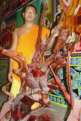 | Le bonze supérieur Danh Huoi à côté d’une œuvre fabriquée par les moines de la pagode Phnô Rôkar. |