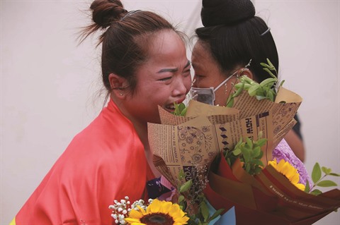 | Les larmes de joie de Lo Thi Hoàng (gauche), issue de l’ethnie Thai, après avoir battu le record des SEA Games du lancer du javelot. |