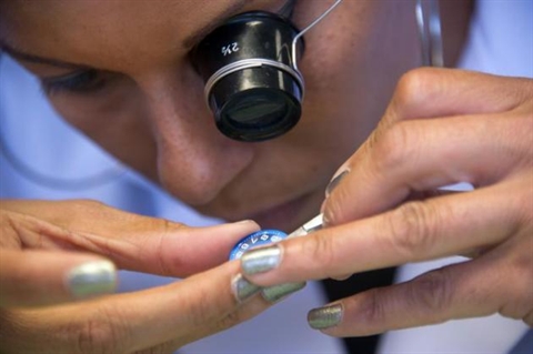 | Une employée répare une montre LIP dans un atelier de la Société des montres bisontines qui a repris la célèbre marque, le 6 mai 2015 à Châtillon-le-Duc, près de Besançon. |